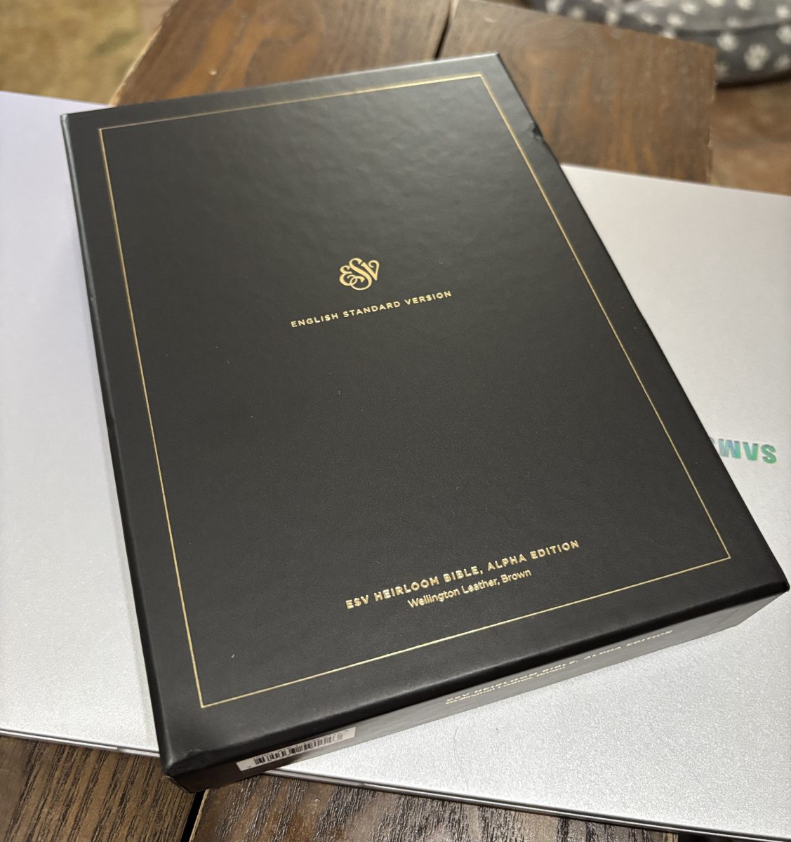 The ESV Heirloom Bible, Alpha Edition is a high-quality hand-size ESV from Crossway that’s both portable and readable. It’s available in black goatskin and brown Wellington leather, ISBN: 9781433591143, printed and bound in the Netherlands by Jongbloed.