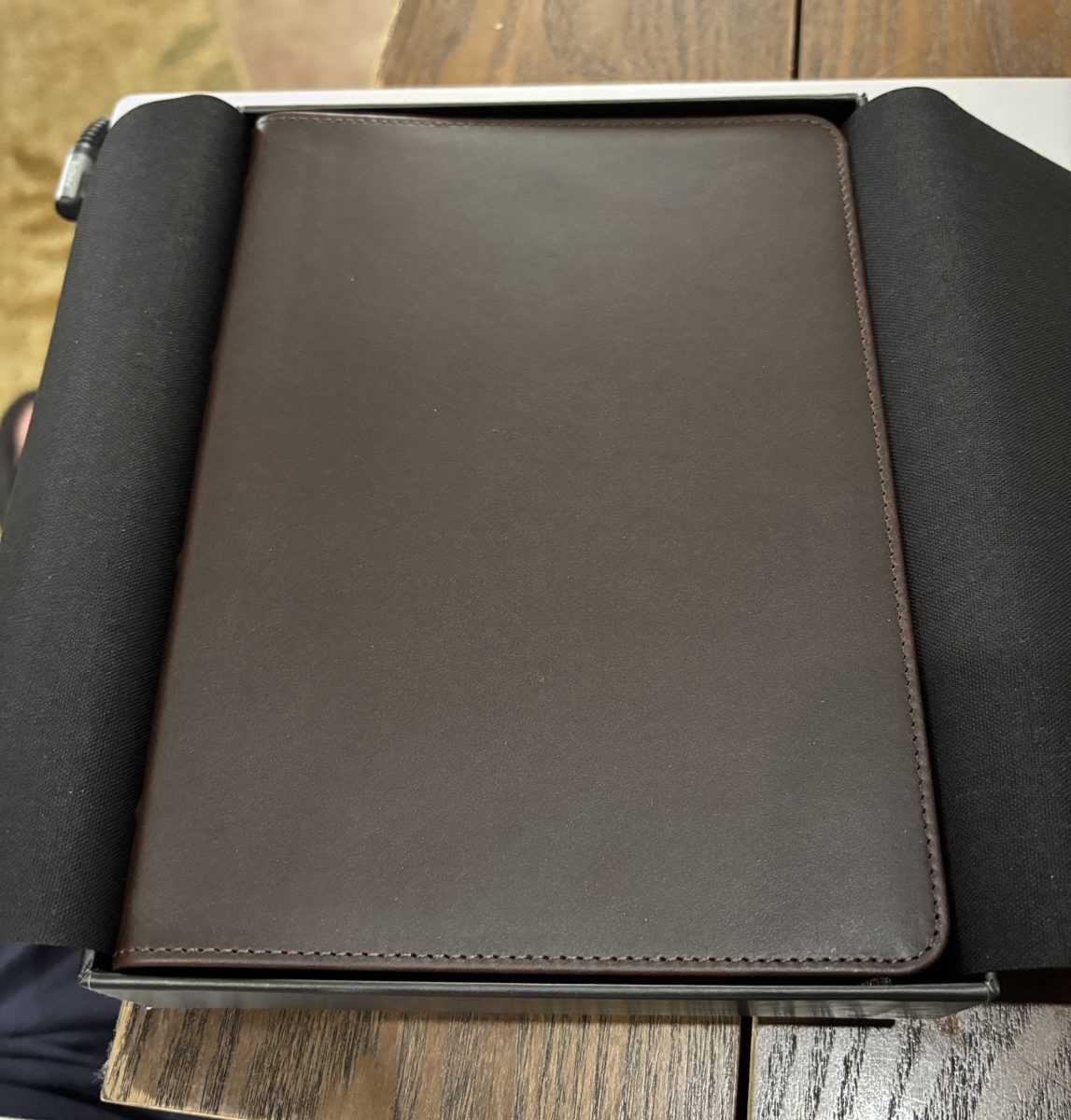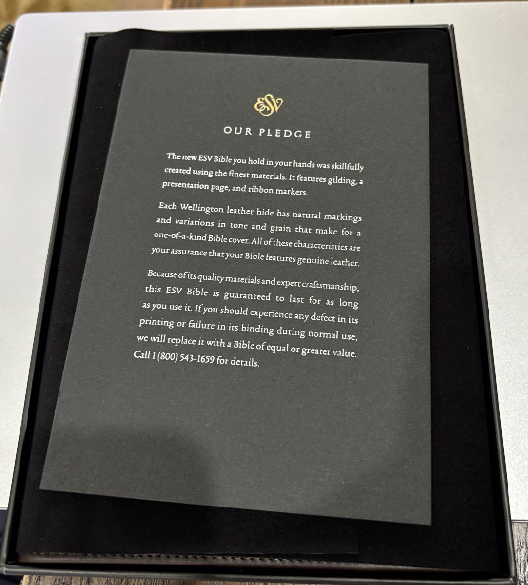 The cover is brown Wellington leather from Valencia, Spain by Cromwell. This is a high grade of cowhide. It’s smooth to the touch and looks and feels elegant. It’s dark brown and has a little bit of color variation. The leather does seem to take scratches easily, so it’s similar to Horween leather. The cover is stiff enough to hold flat in the hand. There is no printing on the front. The spine includes the standard ESV text dry stamped with no color on the spine. It has four raised hubs. The cover also includes perimeter stitching.
