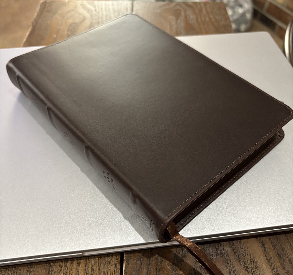 The liner is edge-lined leather. The tab isn’t as stiff as most Bibles of this size. The block is sewn. Due to the small size of the text block, it will take some use before it will stay open in Genesis. It includes two 1/4″ brown ribbons. They’re angle-cut and long enough to pull to the corner to open the Bible easily. The overall size is 5.5 x 7.6 x 1.25″, and it weighs 1 lb, 4.5 oz. This is the perfect size for carrying and reading.