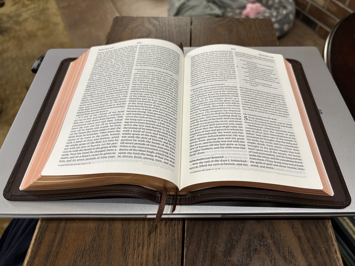 The paper is a high-quality European Bible paper. It’s 28GSM and has a premium coating. It’s smooth to the touch and is highly opaque. The color is slightly cream, which is my personal favorite color for Bible paper. There is no glare under direct light find it great on the eyes for long periods of reading. It can take an extra second to turn the pages, but it’s not too difficult. The page edges are red under gold. It has more of a salmon color when the Bible is opened.