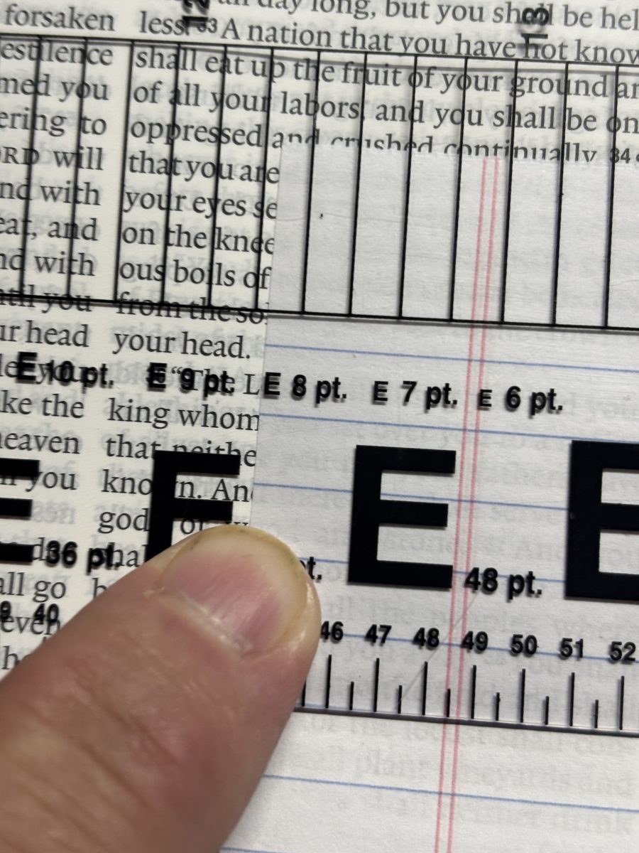 The typeface is 8-point, black letter. The text is dark and consistent throughout. It has extra whitespace in the text to make it highly readable. It was printed with line-matching, meaning that the lines on both sides of the page are printed in the same location to reduce show-through. Verse numbers are larger than normal to help make them easier to find. They’re not bold, so it will take an extra second to find them, but I did find the verses easy to locate. Footnote callers are large and bold, but they don’t stand out too much. I find the text to be highly readable.
