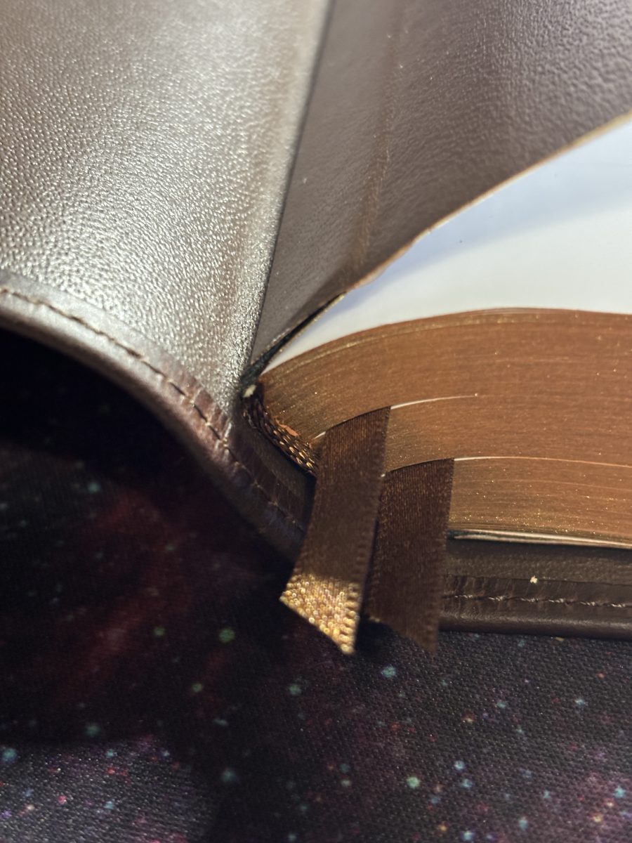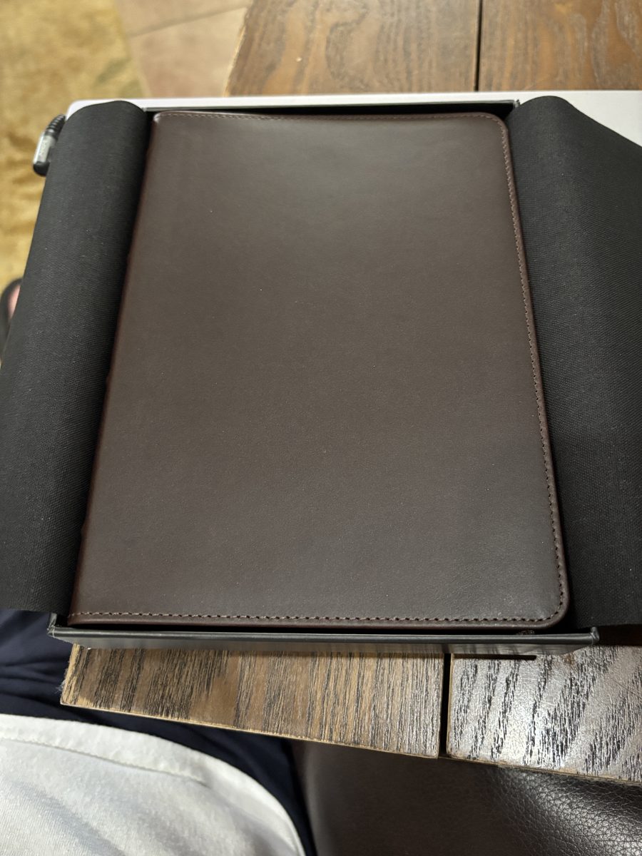 The cover is brown Wellington leather from Valencia, Spain by Cromwell. This is a high grade of cowhide.