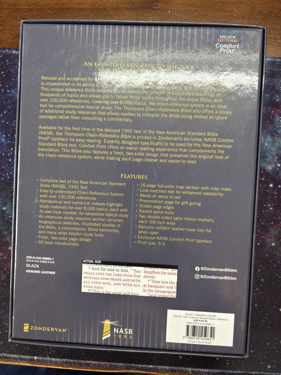 Title : NASB, Thompson Chain-Reference Bible, Genuine Leather, Calfskin, Black, 1995 Text, Red Letter, Comfort Print